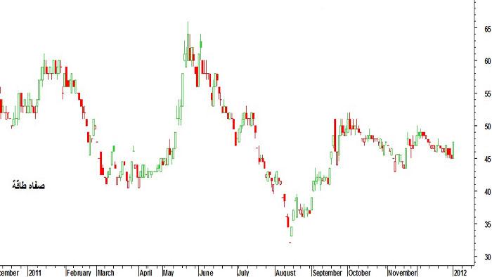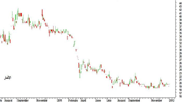 وفي نوفمبر الماضي ارتفع السهم من سعر 43 فلسا حتى وصل الى 50 فلسا ثم انخفض ليصل الى مستوياته الحالية والتي تشكل فيها 45 فلسا دعما أولا للسهم في حين ان 43 فلسا هي الدعم المحوري المانع للانزلاق للاسفل، اما مقاومته الاولى فهي 47 فلسا و52 فلسا هي مقاومته الثانية.