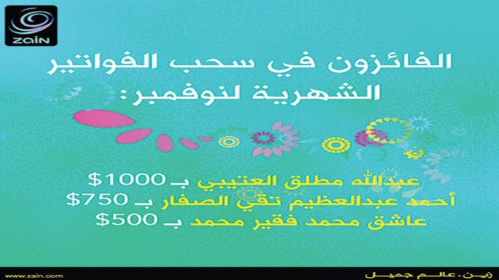 وأعلنت الشركة أسماء الفائزين في سحب الفواتير لشهر نوفمبر والبالغ عددهم ثلاثة فائزين وهم عبدالله مطلق العتيبي الفائز الأول بمبلغ 1000 دولار، الفائز الثاني أحمد عبد العظيم الصفار 750 دولاراً، والثالث عاشق محمد فقير 500 دولار.