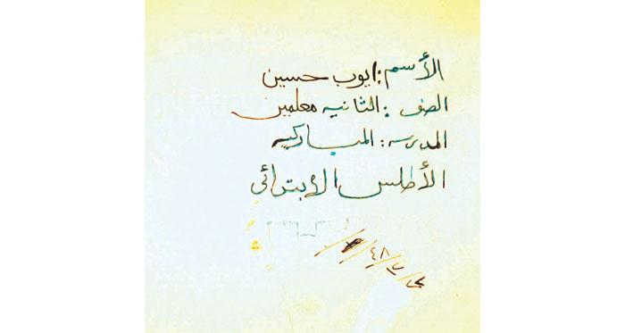 اطلس ايوب حسين في الصف الثاني لعام 1948 في المدرسة المباركية