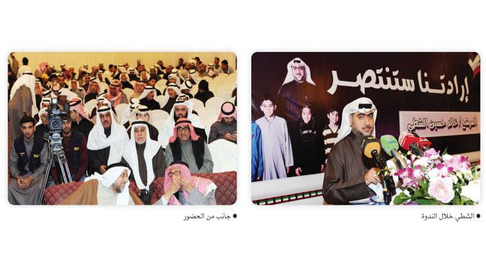 وكشف الشطي خلال تدشين حملته الانتخابية تحت شعار «ارادتنا ستنتصر» مساء امس الاول في صالة قبازرد في منطقة الرميثية امام ناخبيه من ابناء الدائرة الاولى الذي حضرها رجال ونساء ان الكويت اصبحت كلها ساحة ارادة لاننا كويتيون اهل عزة وشهامة وارادتنا ستنتصر بفضل ارادة الرجال والشباب وصمود النساء والفتيات بكل عزيمة واصرار.