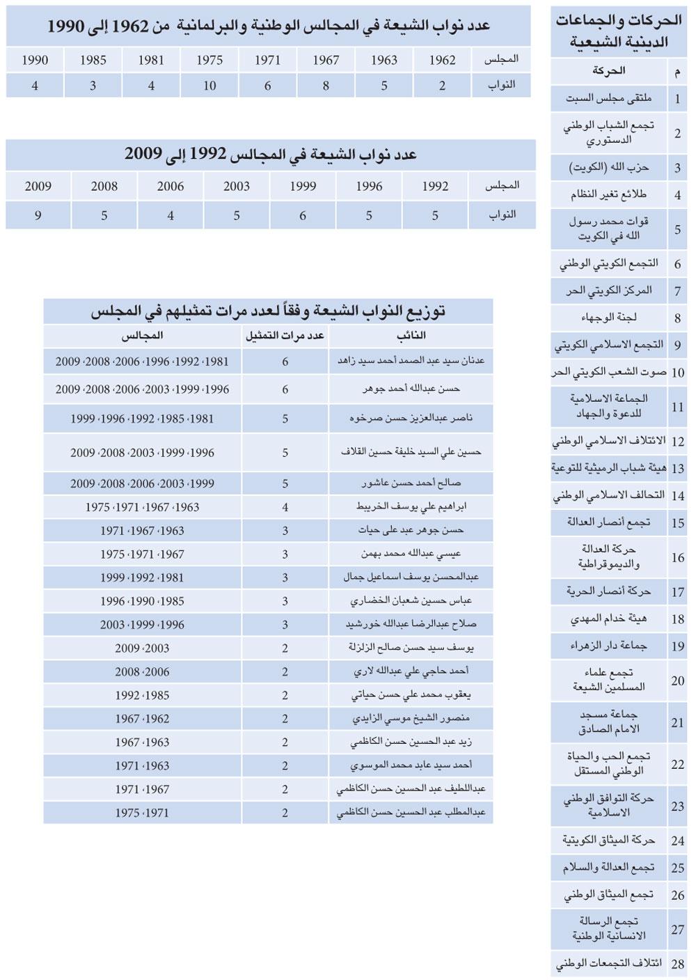 وخلال الفترة من 1992 و2009 تراوح عدد نواب الشيعة بين 4 نواب وكان ذلك في مجلس 2006، و(9) نواب وكان ذلك في مجلس 2009، بينما كان الرقم (5) ثابتاً في مجالس 1992، 1996، 2003، و2008، وهو ما يوضحه الجدول رقم (3).