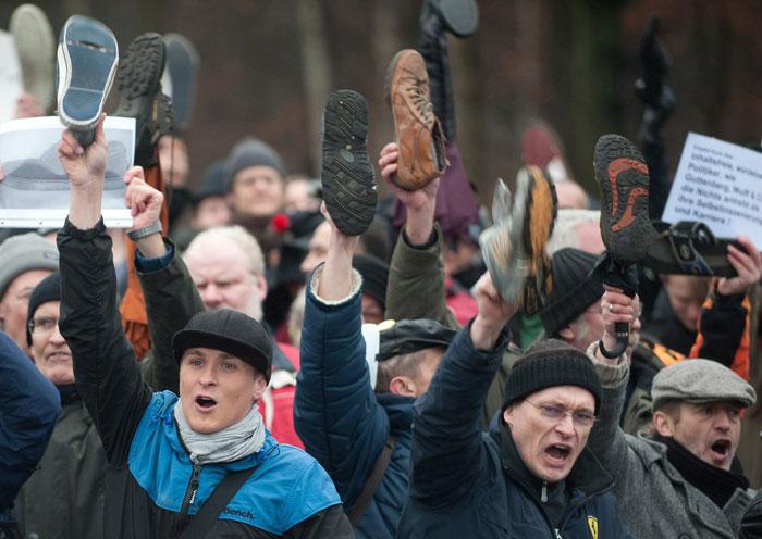 وأكد المتحدث باسم منظمي الاحتجاج يورجن ينين «نريد فقط رفع الأحذية لا ان نقذف بها».