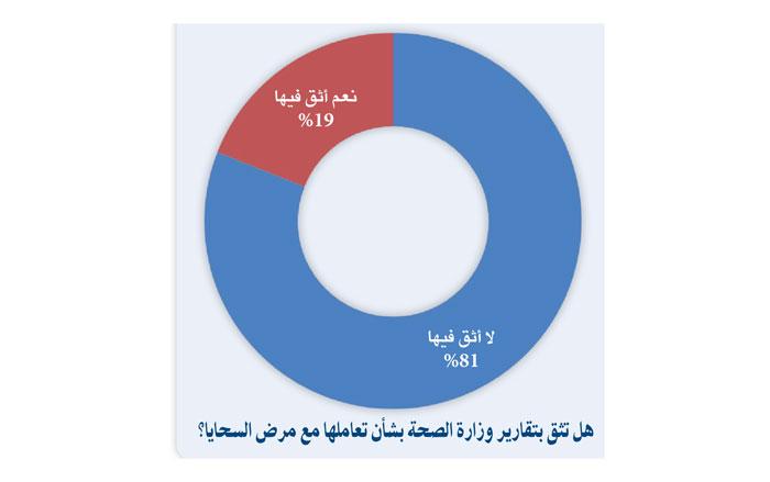 وفي ذات الموضوع، أظهر استطلاع عن تقارير وتصريحات وزارة الصحة حول التهاب السحايا أجرته «الوطن الالكترونية» على شبكة التواصل الاجتماعي «تويتر» ان %81 من المواطنين لا يثقون في تقاريرها أو تصريحات مسؤوليها، مقابل %19 قالوا انهم يثقون بما يصدر عن الوزارة.وعلق بعض من متابعي «الوطن الالكترونية» ان المجتمع يريد دائما معرفة الحقيقة بكل شفافية مهما كانت قاسية.