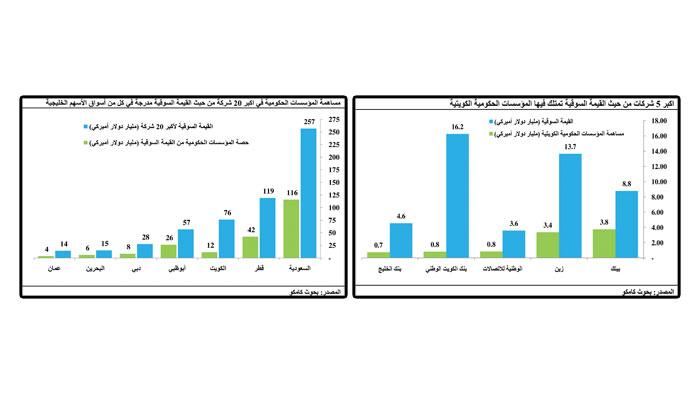 قال تقرير صادر عن ادارة بحوث الاستثمار في شركة مشاريع الكويت الاستثمارية لادارة الأصول (كامكو) تناول نسب ملكية المؤسسات الحكومية الخليجية في الشركات المدرجة أنه تم اختيار أكبر 20 شركة مدرجة من حيث القيمة السوقية من كل سوق، اذ بلغت القيمة السوقية لأكبر 140 شركة مدرجة في أسواق الأسهم الخليجية من أصل اجمالي 640 شركة حوالي 566 مليار دولار وشكلت %7 من اجمالي القيمة السوقية للبورصات الخليجية مجتمعة. فيما بلغت القيمة السوقية لملكية المؤسسات الحكومية في الـ140 شركة حوالي 214 مليار دولار أو ما يعادل %38 من القيمة السوقية.