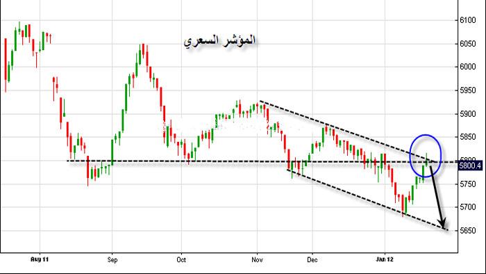 اما بالنسبة لحركة المؤشر السعري وفقاً لبيانات التحليل الفني التقني فان المؤشر يقع في منطقة مقاومة رئيسية تتمثل في حاجز الـ 5800 نقطة، ومن المتوقع ان يشهد السوق خلال الجلسات المقبلة موجة تصحيح وجني ارباح قد تهبط بالمؤشر الى مستوى الـ5750 نقطة، وهو ما يؤكده التباين بين المؤشر السعري والوزني، وفي حال لم يستطع المؤشر الصمود عندها فقد ينزلق نزولاً الى مستوى الـ5650 نقطة امتثالاً مع القناة الهابطة التي تحكم حركة المؤشر السعري منذ بداية نوفمبر من العام الماضي.