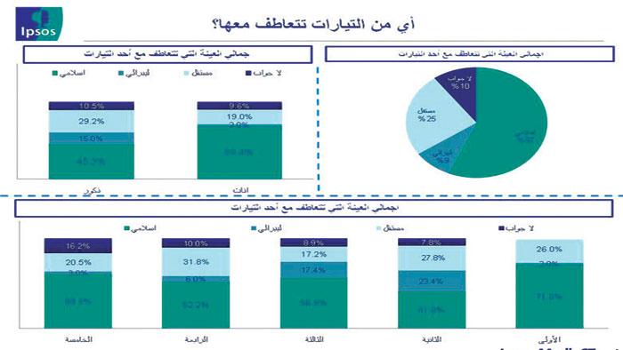 في حين يختلف الأمر لدى الذكور إذ يقرر %45.3 التعاطف مع الإسلاميين و%15 مع الليبراليين و%29.2 مع المستقلين وبقي %10.5 بلا إجابة.