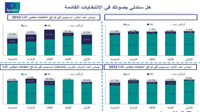 في اشارة الى ان الانتخابات المقبلة ستشهد اقبالاً كثيفا اذ تبين النتيجة ايضا ان %8.3 من الشريحة الاولى لم يقرروا بعد في حين اقتصرت نسبة عدم المشاركة في هذه الشريحة على %9.1 وكانت في الشريحة الثانية (الرجال) %6.8 لاينوون الاقتراع و 4.9 لم يقرروا في حين كانت في النساء %11.2 لن يقترعن و %11.4 لم يقررن وفي الشباب %11 لن يشاركوا و %7.6 لم يقرروا.