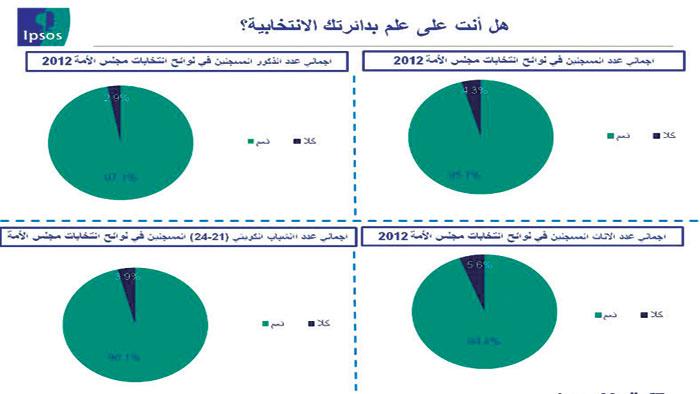 وبالعودة الى المشاركة في الانتخابات ففي الاجابة عن سؤال هل ستدلي بصوتك في الانتخابات القادمة اجاب %82.5 من اجمالي المسجلين بنعم و %88.4 من الذكور بالاجابة نفسها وايدهما %77.4 من الاناث و %81.4 من الشباب بين 21 و 24 عاماً.