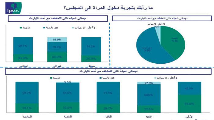 ووفق الاستبيان فان تجربة المرأة لم تحظ بالاشادة فقد رأتها نسبة %56 من العينة المتعاطفة مع احد التيارات غير ناجحة بين قابلها %40 قالوا انها ناجحة. ورأى %74.2 من المتعاطفين مع المستقلين انها غير ناجحة ووافقهم %39.9 من المتعاطفين مع الليبراليين و%69.1 والمتعاطفين من الاسلاميين. في حين رأى %40.2 المتعاطفين مع الليبراليين في العينة انها ناجحة وكذلك وافقهم %30.9 من المتعاطفين مع الاسلاميين و%25.8 من المتعاطفين مع المستقلين.