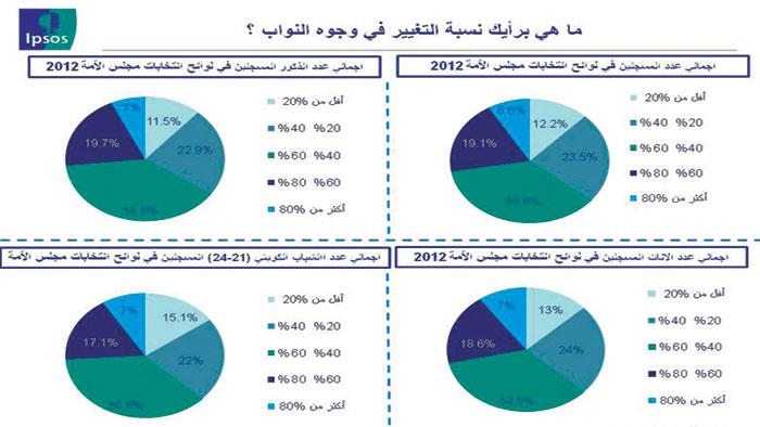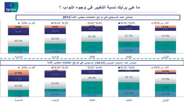 توقعات التغيير في وجوه النواب تبدو متقاربة بين الشرائح الأربع المستبين رأيهم إذ يتوقع %36.6 من إجمالي المسجلين أن تكون نسبة التغيير بين 40 و%60 في حين توقع %23.5 منهم أن تكون بين 20 و%40 ورأى %19.1 أنها بين 60 و%80 وتوقع %8.6 أن تكون أكثر من %80 في حين توقع %12.2 منهم ان تكون نسبة التغيير اقل من %20.