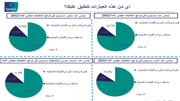 أما الانتماء السياسي للمجرى عليهم الاستبيان فإن %76.3 ليس لديهم أي انتماء سياسي من إجمالي المسجلين أما الذكور فإن نسبة %76.5 منهم أيضا ليسوا منتمين في حين كانت النسبة لدى النساء أقل قليلاً حيث توقفت عند %76.2 وانخفضت لدى الشباب إلى %75.9.