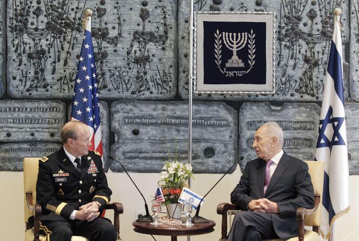 الرئيس الإسرائيلي شيمون بيريز والجنرال ديمبسي في تل أبيب أمس (أ ف ب)