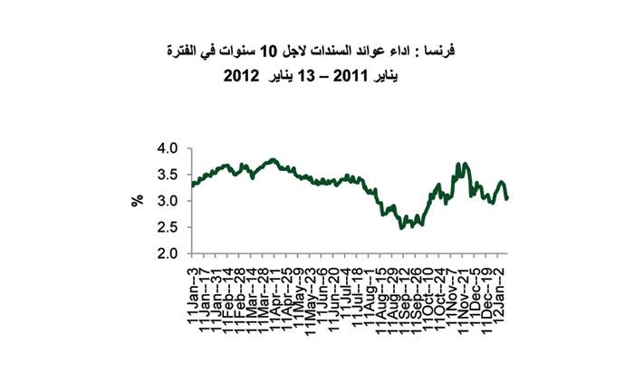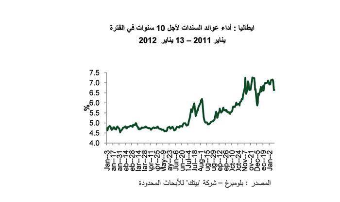 وفي الوقت نفسه، قد قلت تكاليف الاقتراض أيضا.وانخفضت عوائد السندات لأجل عشر سنوات بشكل حاد، وصولا الى %5.17 في اسبانيا و%6.64 في ايطاليا، مع انخفاض تكاليف الاقتراض دون مستوى %7 الذي سيكون مكلفا في المدى الطويل للاقتصاديات ولكن ليس بشكل مستدام.تزامنا مع انخفاض في النمو للدول.وقد باعت ايطاليا في مزاد أقيم في 28 ديسمبر 2011 سندات بقيمة 9 مليارات دولار بمعدل يقترب من نصف معدل الفائدة على المزاد السابق الذي أقيم في نوفمبر2011، بينما أصدرت بلجيكا سندات بأكثر مما كان مخططا له وذلك في مزادها الذي أقيم في3 يناير 2012.