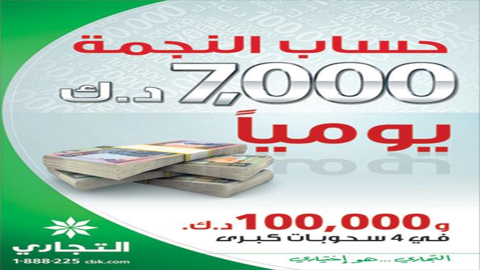 ويتميز حساب النجمة الجديد بتأهيل عملائه الفوز بجائزة يومية قدرها 7000 دينار، لينفرد البنك التجاري بتقديم اكبر جائزة سحب يومي، بالاضافة الى أربعة سحوبات كبرى تجرى خلال العام تبلغ قيمة كل جائزة منها 100.000 دينار تقام في العيد الوطني والتحرير، عيد الفطر، وعيد الأضحى المبارك بالاضافة الى ذكرى تأسيس البنك في 19 يونيو.