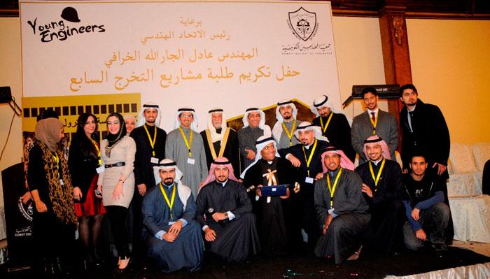 أقامت لجنة المهندسين الشباب في جمعية المهندسين الكويتية حفلها السابع لتكريم طلبة مشاريع التخرج في كلية الهندسة والبترول مساء أمس الاول في فندق الموفمبيك، وذلك برعاية رئيس الاتحاد الدولي للمنظمات الهندسية عادل الجار الله الخرافي، ومشاركة صالح الغنام وعميد كلية الهندسة الدكتور حسين الخياط، وعدد من اساتذة الكلية وأعضاء مجلس ادارة جمعية المهندسين الكويتية.