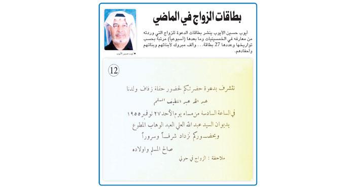 أيوب حسين الأيوب ينشر بطاقات الدعوة للزواج التي وردته من معارفه في الخمسينات وما بعدها (أسبوعيا) مرتبة بحسب تواريخها وعددها 27 بطاقة... ألف مبروك لأبنائهم وبناتهم وأحفادهم.
