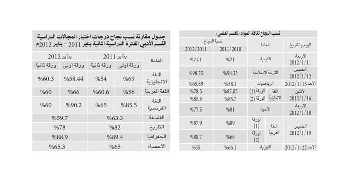 وأوضح جدول المقارنة ان نسبة النجاح في العام الحالي في مادة الرياضيات كانت %71.1 في حين كانت %71 في العام الماضي، بينما انخفضت نسبة النجاح في اللغة الانجليزية «الورقة الأولى» لهذا العام الى %78.5 بعد ان كانت النسبة في العام الماضي %87.5، الا ان النسبة كانت متقاربة في «الورقة الثانية» في العامين. كما أوضح الجدول ارتفاعا في نسبة النجاح لبعض المواد مثل التربية الاسلامية واللغة الفرنسية والاحصاء وانخفاضا في مواد أخرى مثل الأحياء والفيزياء والفلسفة والتاريخ والجغرافيا.