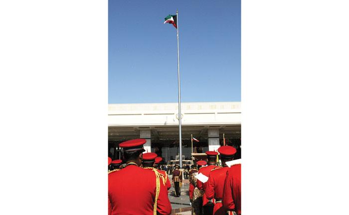 سمو الأمير مقبلا علم البلاد لدى الاحتفال بمراسم رفع العلم