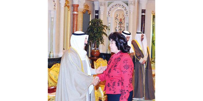 سمو الأمير مصافحاً الشيخة د. ميمونة الصباح