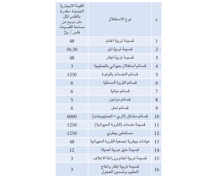 ولفت البدر الى ان الزيادة قدرت على اساس القيمة الايجارية للمتر المربع من مساحة مقدرة بالفلس حسب نوع الاستغلال وبنسبة ضئيلة، اذ تراوحت القيم الايجارية الجديدة في اعلى مستوياتها ما بين (6) دنانير للمتر المربع لقسائم المشاتل الى (3) فلوس للمتر المربع من قسائم تربية الأغنام والابقار.
