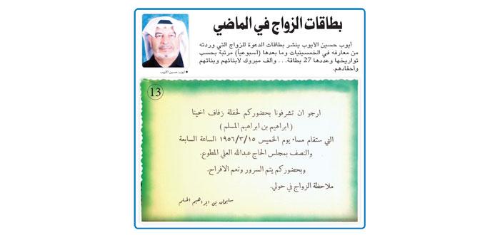 أيوب حسين الأيوب ينشر بطاقات الدعوة للزواج التي وردته من معارفه في الخمسينات وما بعدها (أسبوعيا) مرتبة بحسب تواريخها وعددها 27 بطاقة... ألف مبروك لأبنائهم وبناتهم وأحفادهم.