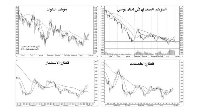 منذ بداية العام انطلق المؤشر باللون الاخضر، ومازالت تداولاته تتم فوق المتوسط المتحرك 50 يوما و10 أيام والتقاطع الذي تم في وقت سابق لهذين المتوسطين كان له الأثر في الارتفاعات والتي عليها ان تواجه 3700 نقطة كمقاومة متوسطة و3870 كمقاومة شرسه له.