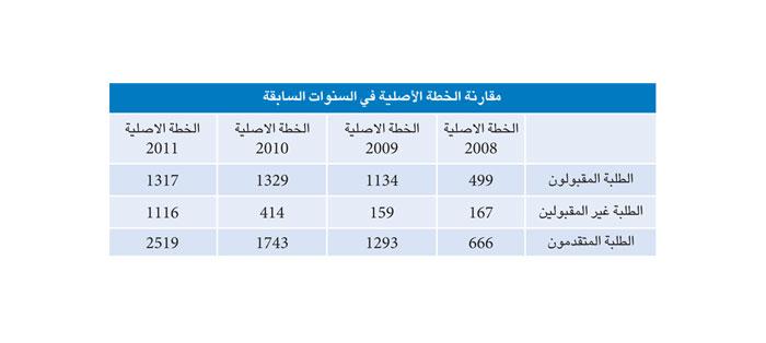 وقارنت الدراسة في نهايتها بين الخطة الحالية عن السنوات الماضية حيث اكدت ان عدد الطلبة يزداد خلال السنوات وان عدد المقبولين على خطة 2010 اكثر من المقبولين على خطة 2011 بـ12 طالبا، وان اعداد غير المقبولين يرتفع ما عدا العام 2009 حيث كانت اعداد المرفوضين اقل من خطة 2008 بـ8 طلاب وطالبات.