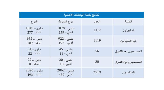 النتائج اوضحت ان نسبة المقبولين في الخطة الاصلية %52 من مجموع الطلبة المتقدمين فيما رفض %44 وانسحب %3، وشهد حصد تخصص الطب البشري كأكثر رغبة اولى لدى طلبتنا يليه الهندسة الميكانيكية.