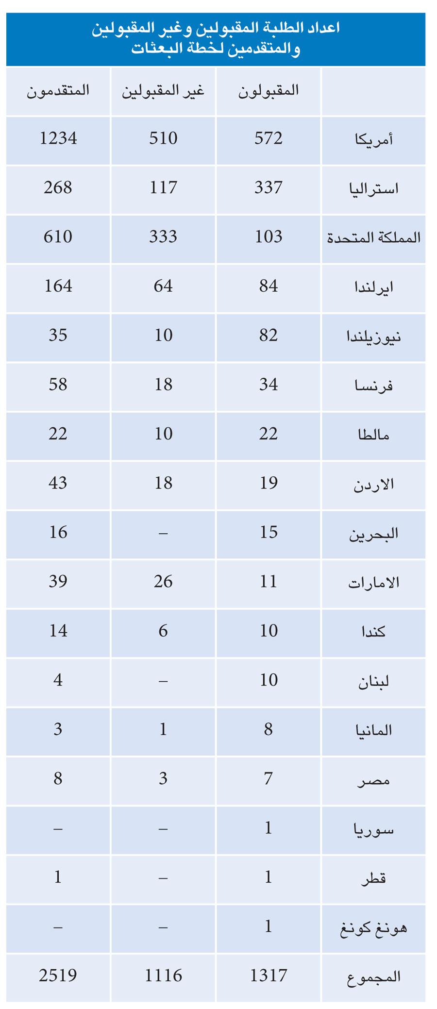 هذا وكشفت الدراسة ان نسبة %49 من طلبتنا يرغبون بالولايات المتحده الامريكية كمقر للابتعاث تليها المملكة المتحده بـ%24، فيما ان %11 من اجمالي المتقدمين على الخطة حددوا استراليا لايفادهم اليها.