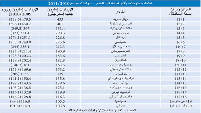 قال تقرير ديلويت لايرادات أندية كرة القدم ان ايرادات أندية كرة القدم العشرين الأكثر دخلاً في العالم المحن الاقتصادية الأوروبية، وسجّلت نمواً بنسبة %3 مقارنةً مع العام المنصرم وقد حققت هذه الأندية ضعف معدل النمو المسجّل في اقتصاديات الدول المدرجة والتي سجلت متوسط نمو لم يتخط %1.7 خلال العام 2010، و%1.3 خلال العام 2011.وقد جمعت الأندية العشرين الكبرى ايرادات بلغت 4.4 مليارات يورو خلال موسم 2011/2010، وهي تمثل ربع اجمالي الايرادات في سوق كرة القدم الأوروبية.كما ان تسعة من أصل هذه الأندية العشرين الكبرى سجلت نمواً مزدوج الرقم خلال العام، وتصدر نادي ريال مدريد القائمة بايرادات 479.5 مليون يورو ثم برشلونة في المركز الثاني بـ450.7 مليون يورو.