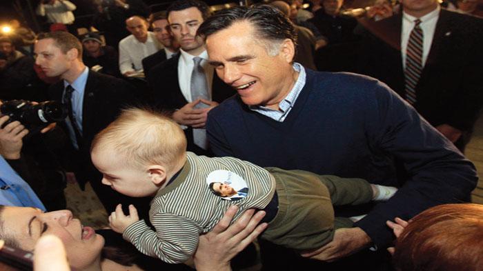 ميت رومني يحمل أحد الأطفال خلال لقائه مع أنصاره في بورتلاند بولاية مين (رويترز)