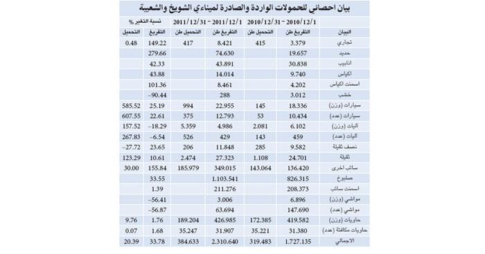 وقال نائب مدير الشؤون المالية حسين الحافظ في تصريح صحافي ان عدد السفن المفرغة والمحملة من الميناءين بلغ 203 سفن، بزيادة عددية بلغت 19 سفينة بنسبة %10.33 عن شهر ديسمبر من العام قبل الماضي 2010 والبالغ عددها 184 سفينة، كما بلغ عدد الحاويات الواردة والصادرة من الميناءين 67 الفا و154 حاوية نمطية خلال ديسمبر 2011، بارتفاع 553 حاوية نمطية عن الفترة نفسها من العام قبل الماضي 2010 والتي بلغت فيه عدد الحاويات في الميناءين 66 الفا و601 حاوية نمطية.