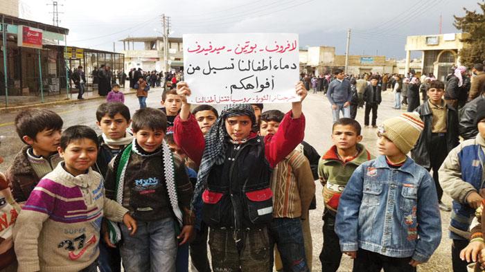 عدد من الأطفال يرفعون لافتة تقول: إن الروس قتلوا أطفالنا خلال مظاهرة احتجاجية بالقرب من ادلب (يو. بي. ايه)