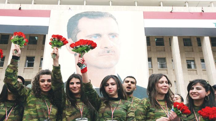 متظاهرات سوريات يرتدين زي القتال المموه ويرفعن الورود الحمراء احتفالا بعيد الفالنتاين أمام صورة بشار الأسد ضمن مظاهرة تأييد له (ا ف ب)