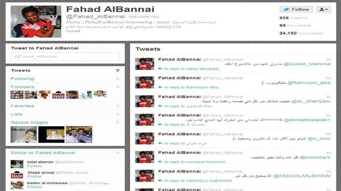 اليوم نطل على لـaccount الممثل الشاب فهد البناي في موقع التواصل «تويتر»، والبناي حريص على ان يرد على معجبيه بنفسه في هذا الموقع حيث ان الـfllowers لديه يتخطى الـ42.150 شخصا وهذا يدل على القاعدة الجماهيرية التي كونها البناي خلال سنوات قليلة.