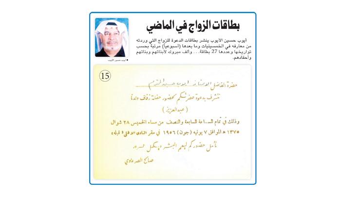 أيوب حسين الأيوب ينشر بطاقات الدعوة للزواج التي وردته من معارفه في الخمسينات وما بعدها (أسبوعيا) مرتبة بحسب تواريخها وعددها 27 بطاقة...