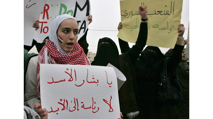 سوريات في الأردن يتظاهرن ضد النظام السوري (رويترز)