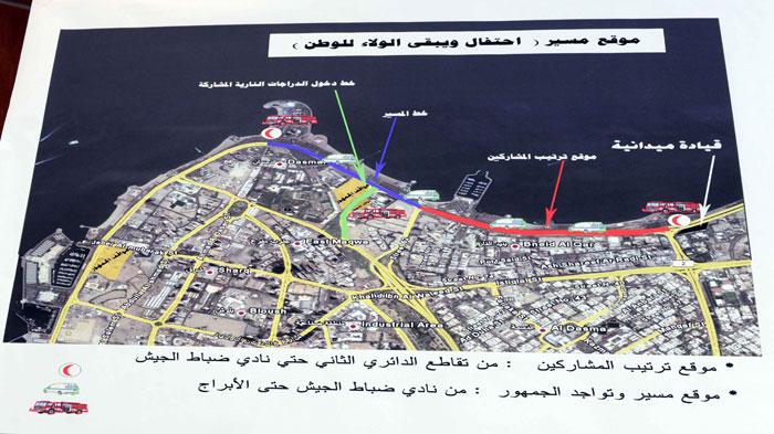 واستعرض المقدم يوسف الخدة من وزارة الداخلية الناحية المرورية ايام الاحتفالات، كاشفا ان وزارة الداخلية خصصت 50 حافلة لنقل الجمهور من المواقع المخصصة لمواقف السيارات الى مكان الاحتفالات، مشيرا الى اغلاق تقاطع الدائري الثاني مع شارع الخليج.