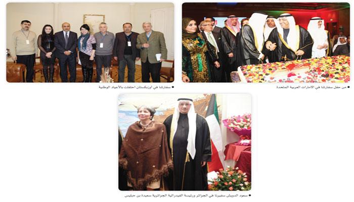 عواصم – كونا: واصلت سفاراتنا وبعثاتنا الدبلوماسية في الخارج احياء أفراح الكويت احتفاء بذكرى العيد الوطني الـ51 ويوم التحرير الـ21 والذكرى السادسة لتولي حضرة صاحب السمو أمير البلاد الشيخ صباح الأحمد الجابر الصباح مقاليد الحكم وسط مشاركات عربية وأجنبية كثيفة عكست متانة العلاقات والروابط الكويتية مع مختلف الدول.
