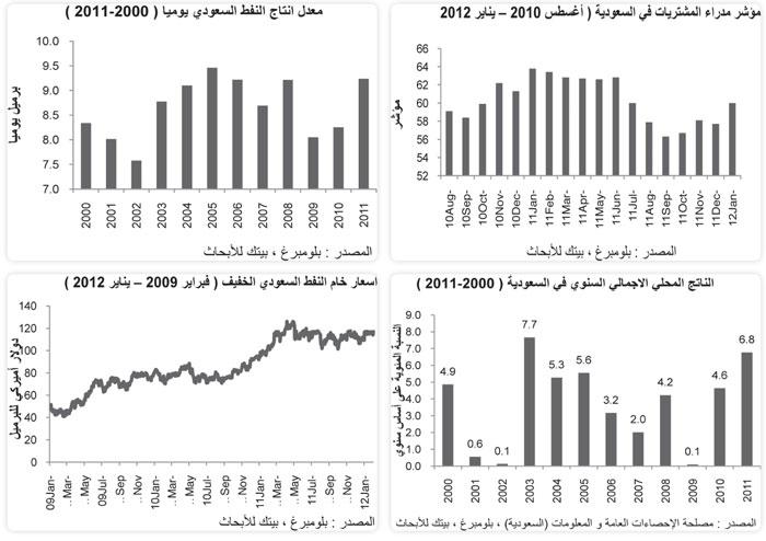 واشار التقرير الى أنه في المنتدى الاقتصادي العالمي في دافوس لعام 2012، توقع وزير المالية السعودي ان يسجل نمو الناتج المحلي الاجمالي نموا بنسبة %6.8 على أساس سنوي في عام 2012 بسبب وجود ميزانية توسعية، والتي سوف تلعب دورا حيويا في دعم الاقتصاد.ومع ذلك، لدينا توقعات ان يسجل اجمالي الناتج المحلي السعودي نموا بأقل من التوقعات الرسمية بسبب التقلبات في أسعار النفط، اضافة الى عدم اليقين في ظروف العرض والطلب في السوق العالمية.ومع ذلك، من المتوقع للأنشطة الداخلية ان تبقى قوية لتحمي الاقتصاد من تباطؤ أكثر عمقا.