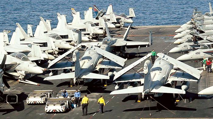 < حاملة الطائرات الأمريكية (يو إس إس) إبراهام لينكولن راسية في الخليج بالقرب من مضيق هرمز (أرشيف) (أ ب)