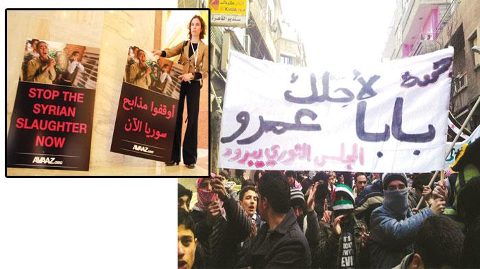 < محتجون سوريون ضد نظام بشار الأسد يرفعون لافتة تدعم بابا عمرو التي تتعرض لهجوم عنيف من لدن القوات السورية وفي الإطار (يسار أعلى) إحدى المشاركات في م