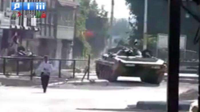 مدرعة تابعة للجيش السوري خلال اقتحامها لمدينة حمص (إ. بي. ايه)