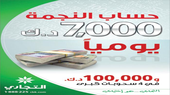 ويتميز حساب النجمة الجديد بتأهيل عملائه الفوز بجائزة يومية قدرها 7000 دينار، لينفرد البنك «التجاري» بتقديم اكبر جائزة سحب يومي، بالاضافة الى أربعة سحوبات كبرى تجرى خلال العام تبلغ قيمة كل جائزة منها 100.000 دينار تقام في العيد الوطني والتحرير، عيد الفطر، وعيد الأضحى المبارك بالإضافة الى ذكرى تأسيس البنك في 19 يونيو.