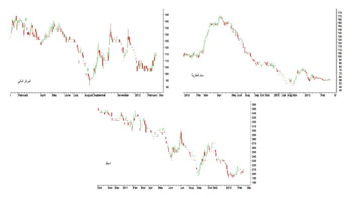 ومنذ اغسطس 2010 والسهم يتخذ اتجاها هابطا حتى وصل في بداية العام الحالي الى أدنى مستوياته منذ عام 2009 وهو مستوى 190 فلسا، بتحركات السهم الأخيرة نجد أنه يقترب من السقف العلوي للقناة الهابطة وذلك بحسب الرسم البياني ذي الاطار الزمني الاسبوعي وتمثل فيها 210 فلوس هذا السقف العلوي مقاومة قوية جدا حال نجاحه في تجاوزها فانه يتخلص من هذه القناة الهابطة وتكون 232 فلسا مقاومته الأولى و260 فلسا مقاومته الثانية، أما دعوماته فهي 202 فلس كدعم أول و190 فلسا كدعم محوري مهم جدا ومانع للانزلاق للأسفل.