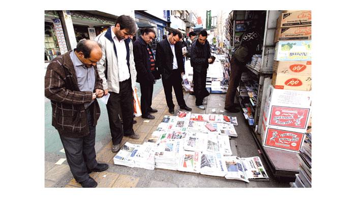 مواطنون إيرانيون في طهران أمام كشك لبيع الصحف التي ركزت عناوينها الرئيسية على الانتخابات البرلمانية المقررة اليوم (أ ف ب)