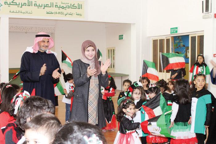 اقامت الاكاديمية العربية الامريكية احتفالا بالعيد الوطني ويوم التحرير لوطننا الغالي الكويت، وذلك تحت رعاية صاحب المدرسة مبارك المطوع، ومديرة المدرسة احلام خطاب، اللذين تمنيا للكويت مزيدا من التطور والتقدم في ظل قيادتها الحكيمة وبجهود شعبها المعطاء.