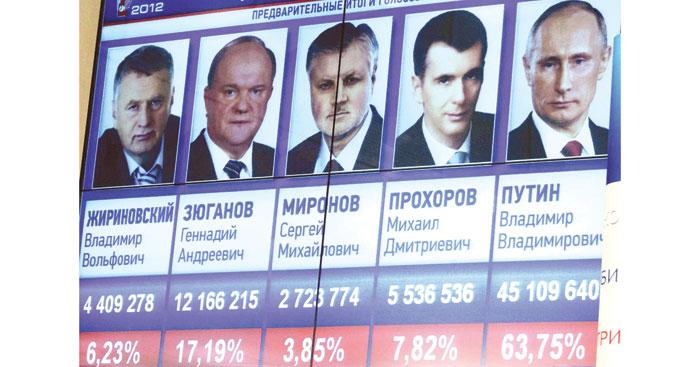 موسكو – ا ف ب: فاز فلاديمير بوتين بالانتخابات الرئاسية التي أجريت الأحد حاصداً %63.9 من الأصوات بحسب نتائج فرز كافة مراكز الاقتراع في البلاد تقريباً.