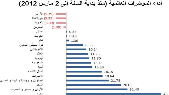قال التقرير الاسبوعي لشركة الوطني للاستثمار عن أداء أسواق المال العالمية إن أغلب مؤشرات الأسواق الاقليمية شهدت ارتفاعا خلال الفترة من 24 فبراير الى 2 مارس 2012 حيث جاء السوق الاماراتي كأكثر الأسواق ارتفاعا عالميا بصعود %5.56 ويليه المصري %4.39 والسعودي %3.78 وارتفع مؤشر دول مجلس التعاون %2.78. أما عالميا فلم يشهد أداء الأسواق تغييرا كبيرا حيث ارتفع مؤشر الدول النامية %1.21 والآسيوي %0.37 والأمريكتين %0.43 والعالمي %0.10 فقط، وتراجع المؤشر الأوروبي %0.80. أما السوق الكويتي فقد كان الأقل تغييرا بارتفاع %0.07. وكان السوق الأرجنتيني الأكثر نزولا للأسبوع عالميا وبنسبة %6.74 يليه الفنلندي والأستوني.