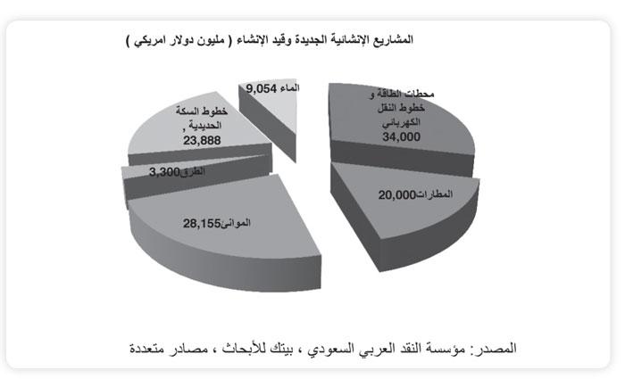 العدد الكبير من المشاريع التي هي قيد التنفيذ والانشاء يسلط الضوء على مستوى النشاط في البلاد، وحجم الفرص المتاحة.ويقدر حجم مشاريع البنية التحتية الجاري تنفيذها في قطاعي النقل والمرافق العامة بقيمة 110 مليارات دولار ويشمل هذا المبلغ اضافة 30 جيجا واط الى الطاقة الكهربائية للبلاد، اضافة الى مبلغ 24 مليار ريال في مشاريع السكك الحديدية.وتعمل المملكة العربية السعودية جاهدة على غرار العديد من نظرائها الاقليميين، لتوسيع البنية التحتية بنفس الوتيرة مع توسيع وتنمية الاقتصاد، وهذا يعني ان أي استثمار في هذا القطاع يجب ان تكون له أهمية كبيرة.وفي جانب آخر من قطاع البنية التحتية، فان هناك مجالا واسعا لقطاع الانشاءات والبناء الذي يشمل كلا من البنية التحتية الاجتماعية والعقارات والمشروعات الصناعية.وبالنظر الى المشاريع الصناعية، تتعلق في معظمها بقطاع البتروكيماويات.